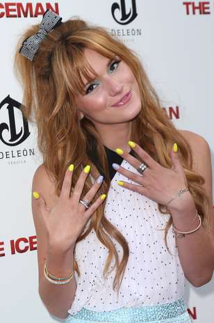 A atriz americana Bella Thorne apostou na filha única. Os dedos anelares receberam tom pastel de azul e bolinhas brancas, enquanto os outros foram pintados de amarelo |